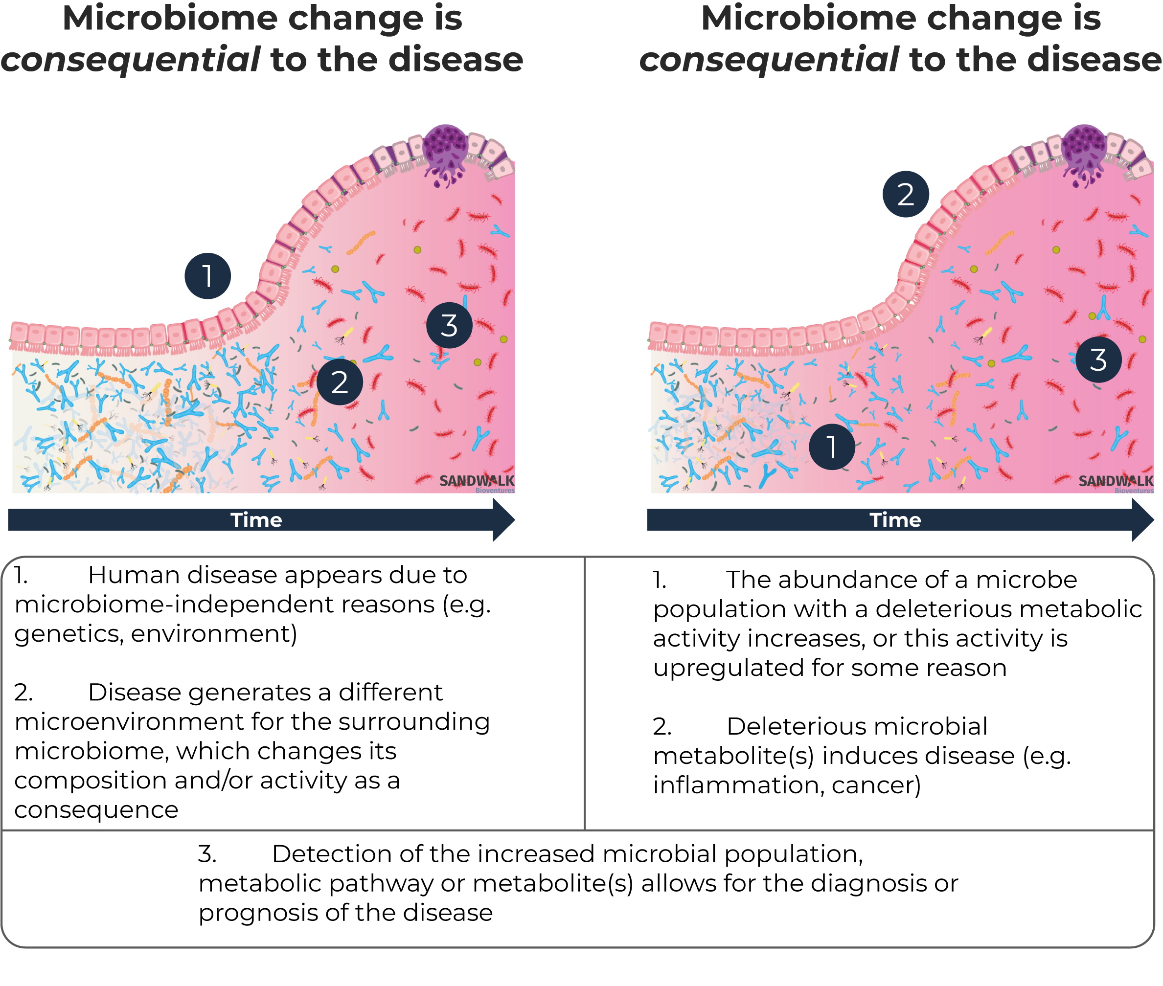 The cause vs.consequence question constantly arises in studies around microbiome and disease. The degree to which observed microbial changes are either the cause of the disease, or a consequence of the disease processes that occur regardless, is largely unknown; authors have recommended caution in assuming causality since the early days of microbiome research [42].